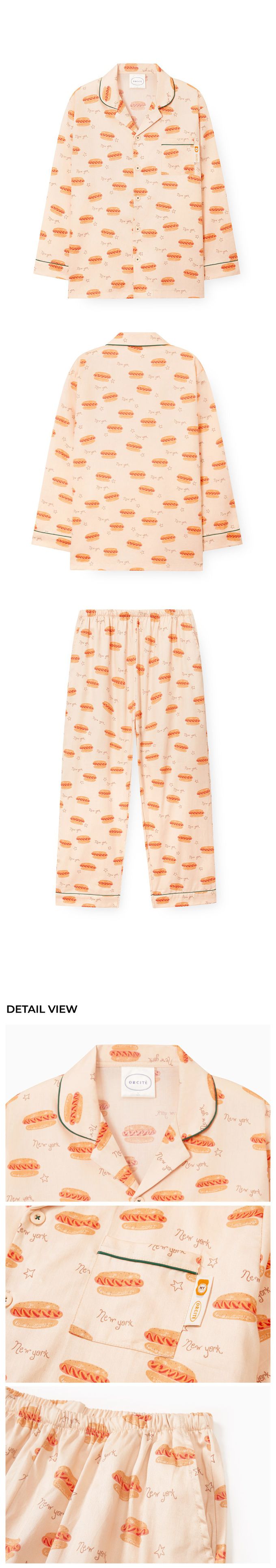 韓國 Orcite - (爸爸)透氣輕柔棉翻領長袖睡衣套裝-紐約熱狗堡-杏膚