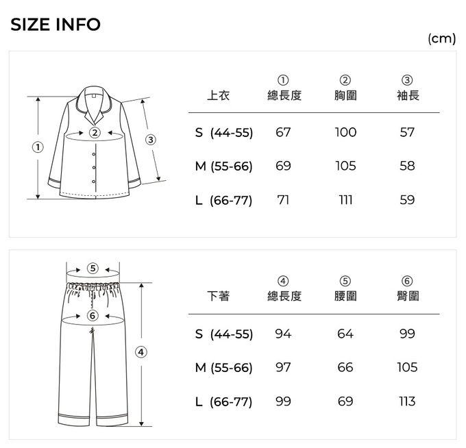 1. 尺寸表單位皆為公分(cm),實際尺寸會因布料彈性、水洗、測量起迄點等因素略有誤差。