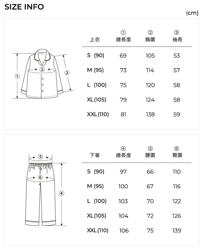 1. 尺寸表單位皆為公分(cm),實際尺寸會因布料彈性、水洗、測量起迄點等因素略有誤差。