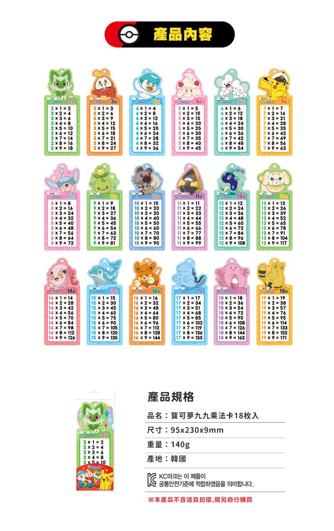韓國 | 小學生九九乘法學習卡-皮卡丘