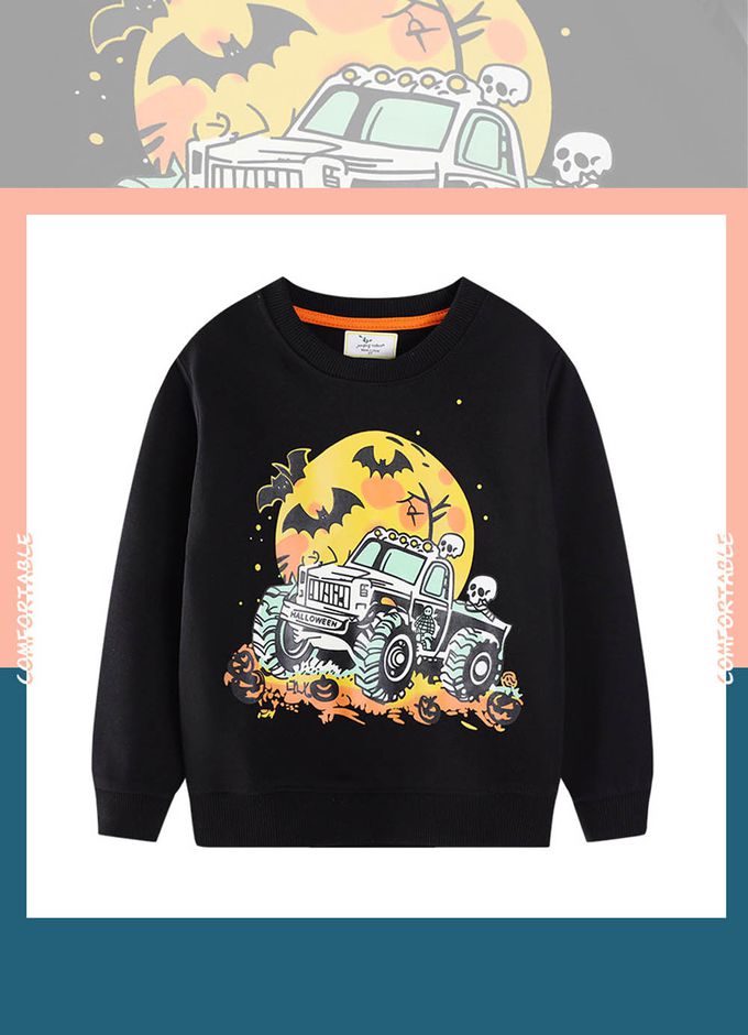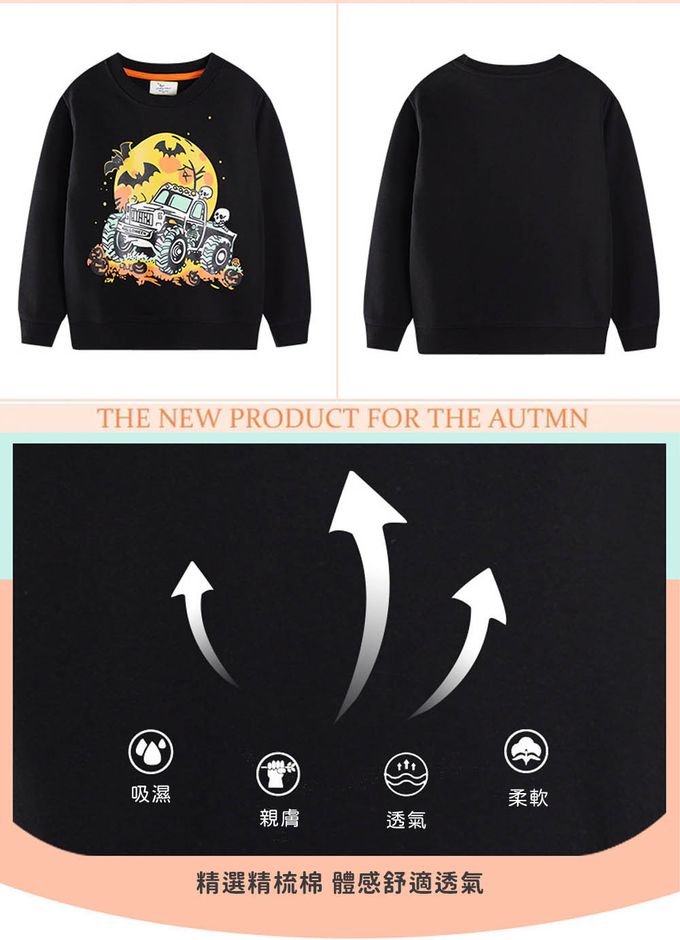 夜光圓領棉質長袖上衣/大學T-黑夜蝙蝠骷髏-黑色