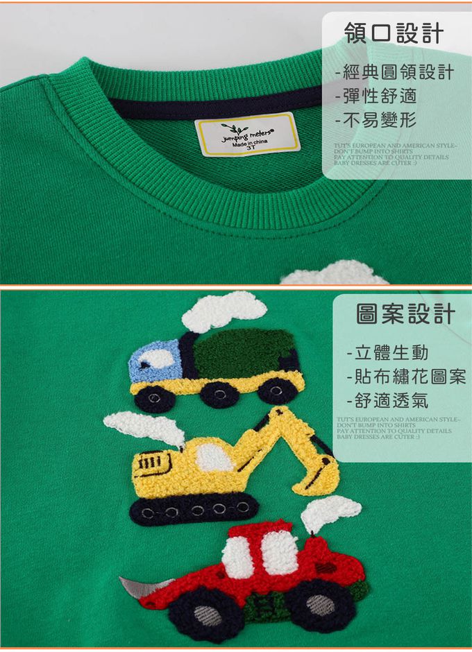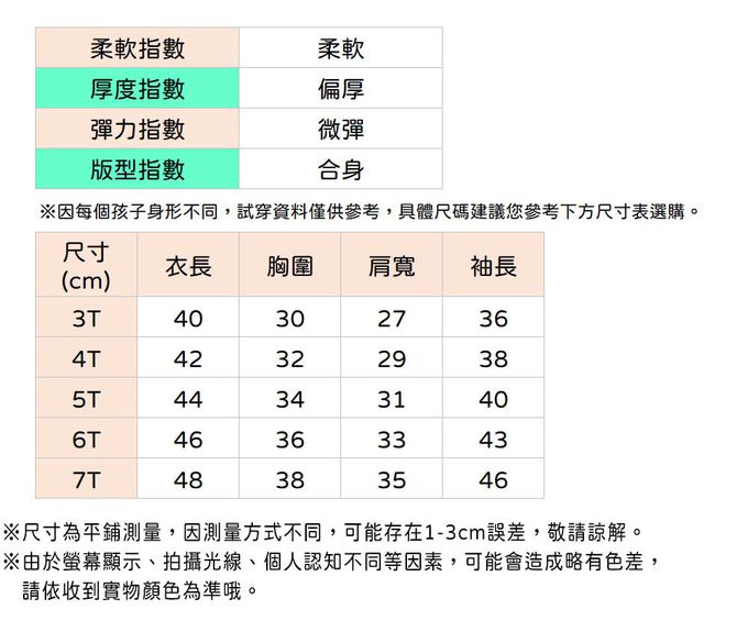 衣服品質是不錯!但給尺寸的方式不ok,看照片可以知道我買三件同jumping meters牌子110-120cm、二件BE TOP牌子120cm,但為何前者jumping meters給的尺寸卻不一樣(即2件5T、1件6T),讓人覺得廠商在給尺寸方式上很不ok!!!