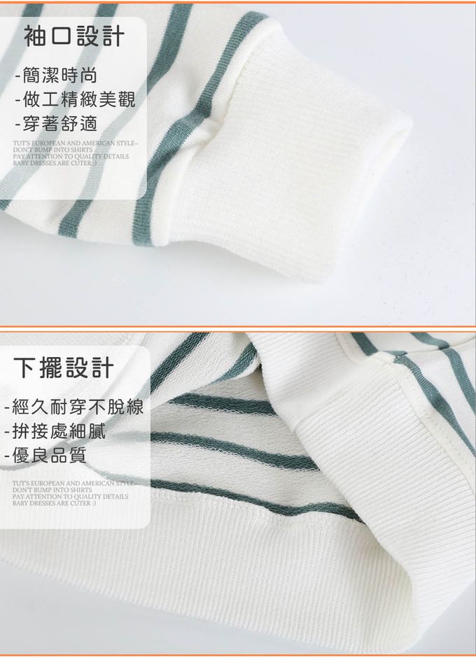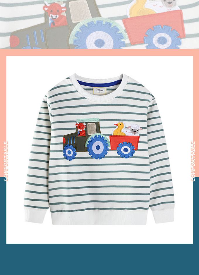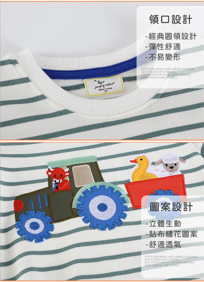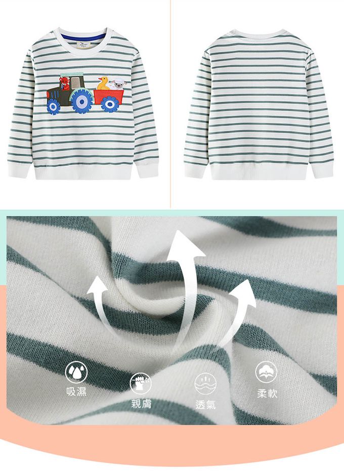 圓領棉質長袖上衣/大學T-牛牛運輸車-灰綠條紋