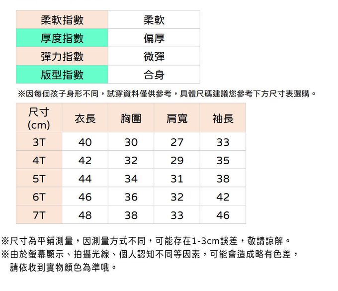 衣服品質是不錯!但給尺寸的方式不ok,看照片可以知道我買三件同jumping meters牌子110-120cm、二件BE TOP牌子120cm,但為何前者jumping meters給的尺寸卻不一樣(即2件5T、1件6T),讓人覺得廠商在給尺寸方式上很不ok!!!