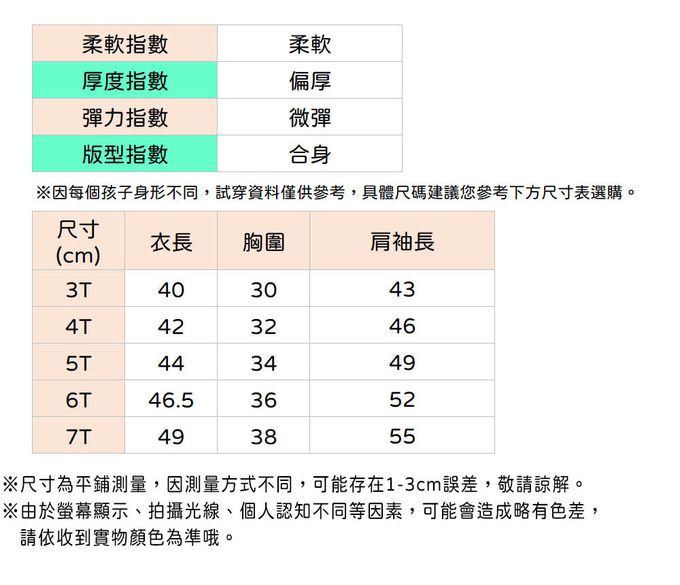 衣服品質是不錯!但給尺寸的方式不ok,看照片可以知道我買三件同jumping meters牌子110-120cm、二件BE TOP牌子120cm,但為何前者jumping meters給的尺寸卻不一樣(即2件5T、1件6T),讓人覺得廠商在給尺寸方式上很不ok!!!