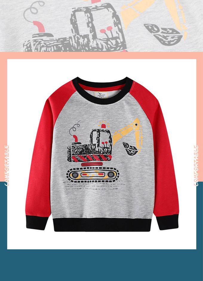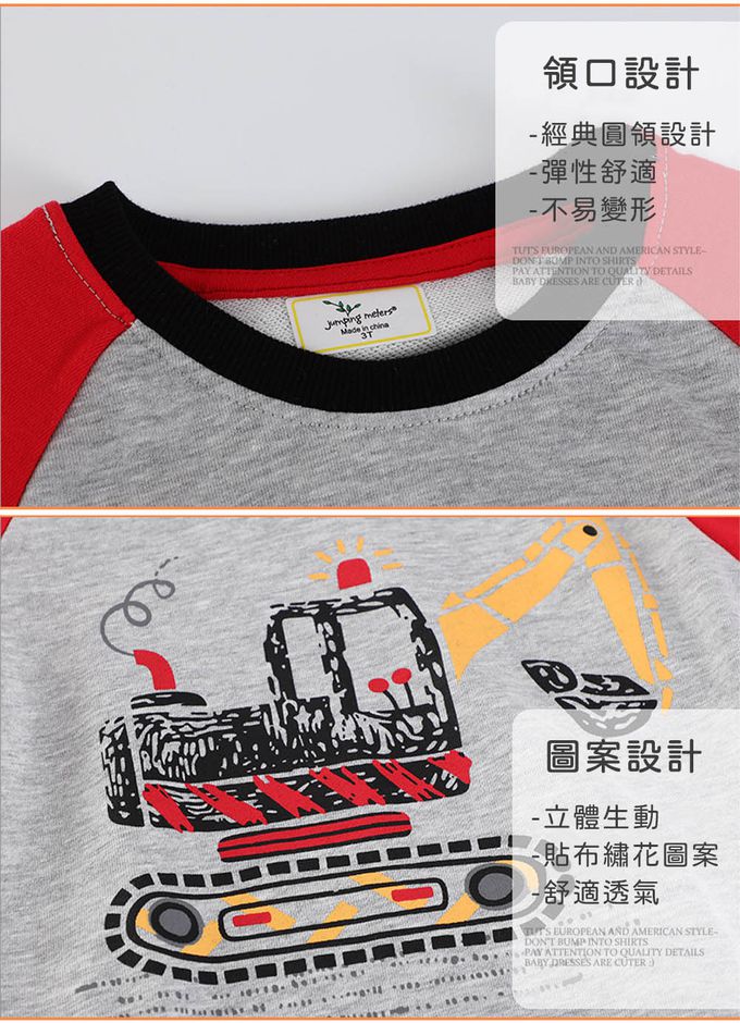 圓領棉質長袖上衣/大學T-彩繪挖土機-拼色灰