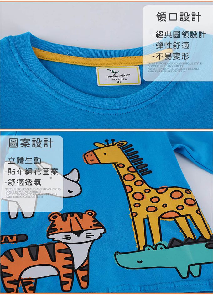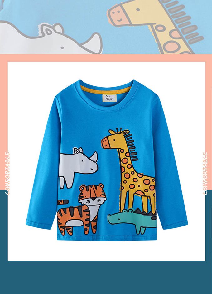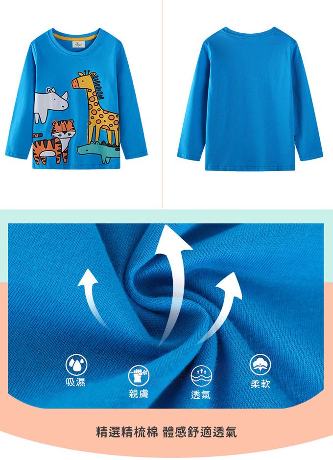 圓領棉質長袖上衣-卡通動物-藍色