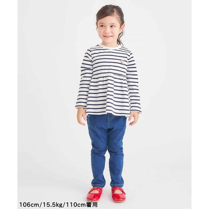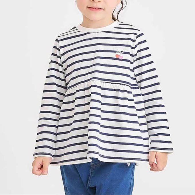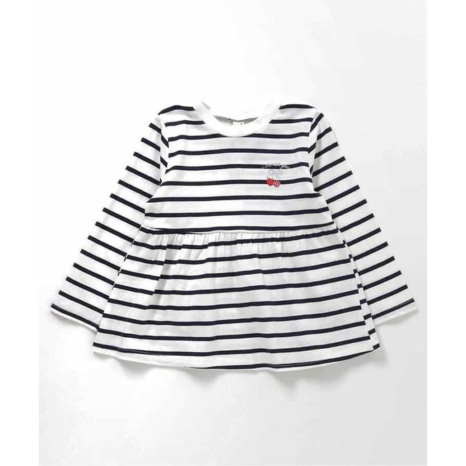 日本 apres les cours - 天天穿飄逸荷葉邊長袖上衣-條紋櫻桃-黑X白