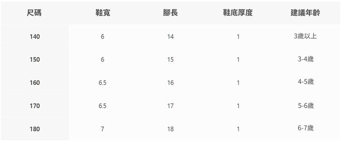 2. 每個尺寸的建議年齡、建議身高僅供參考,每位孩子發育狀況各有不同,建議參考寶貝現有的鞋子尺寸做對照。