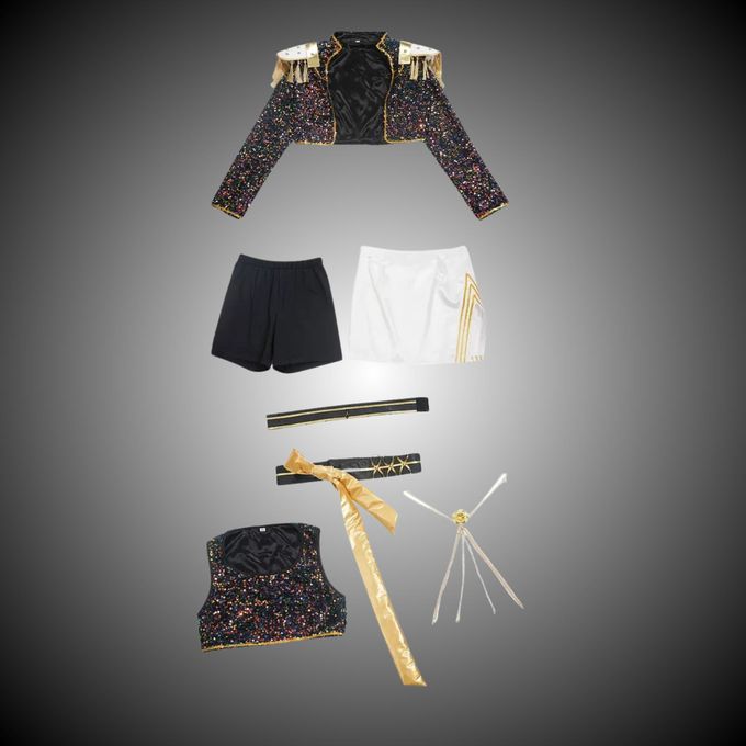 精裝版K-Pop女團打歌造型服M款-萬聖節變裝服-外套+背心+打底褲+短裙+腰帶+緞帶腰繩+掛腰墜飾+頸鏈 (不含假髮+鞋子)