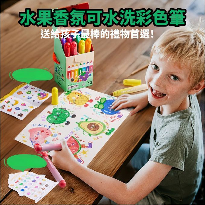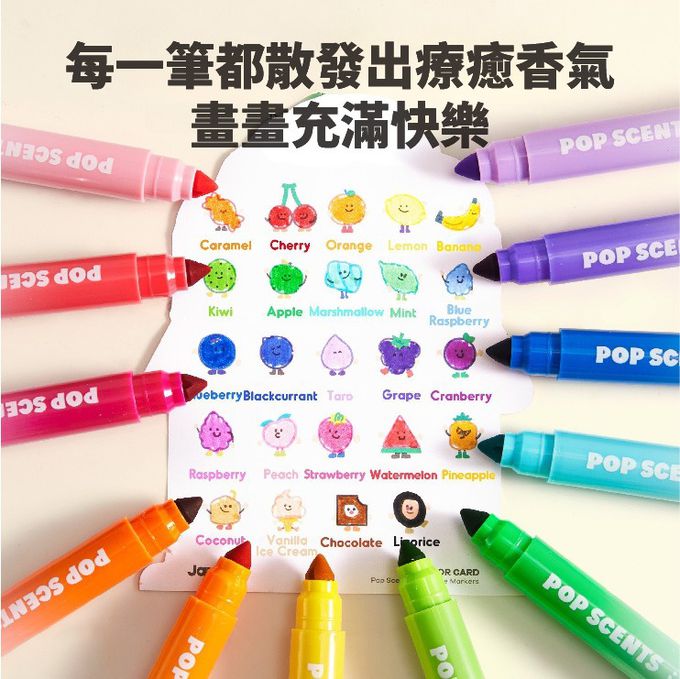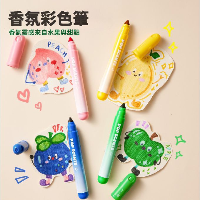 每支彩色筆皆帶有水果或甜點香氛,如蘋果、草莓、巧克力等,讓畫畫過程充滿樂趣。