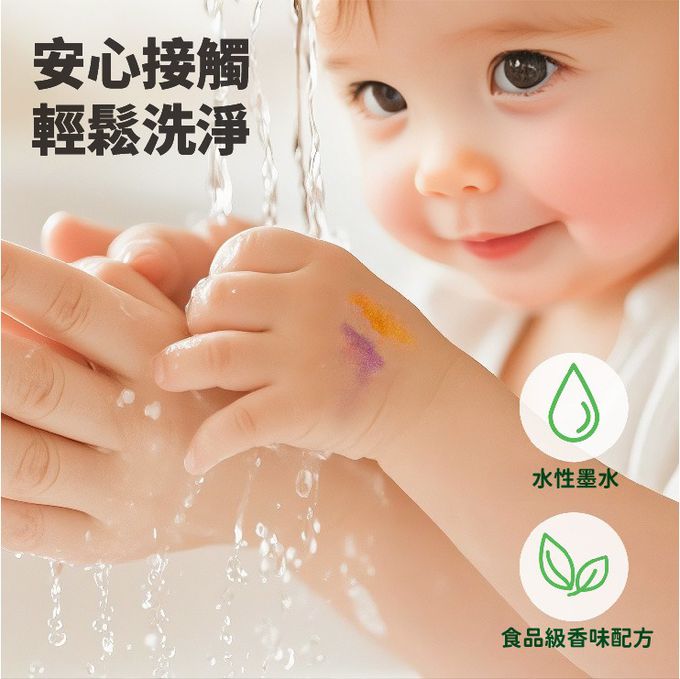 安全水性墨水,若沾到皮膚或衣物可輕鬆清洗,家長更安心。