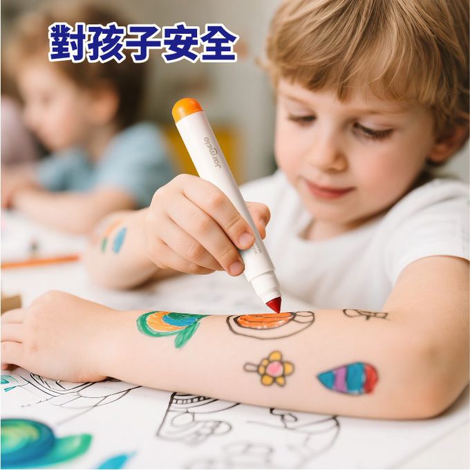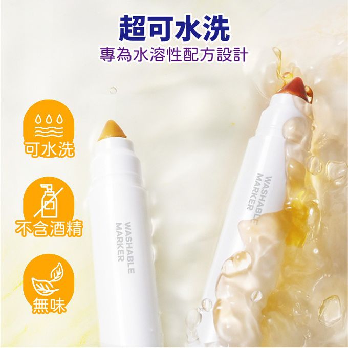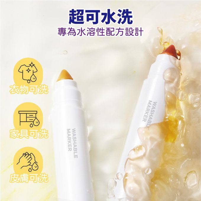採用水溶性墨水配方,筆跡鮮豔飽和,卻能輕鬆用清水洗淨,不論是衣物、家具還是肌膚,都能輕鬆去除色彩痕跡。
