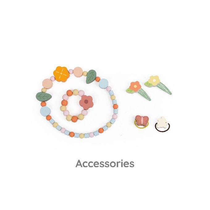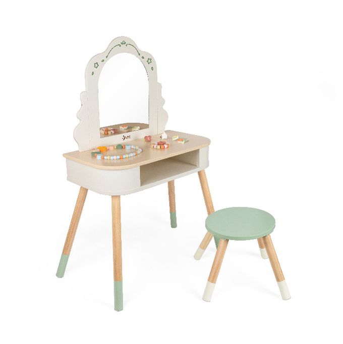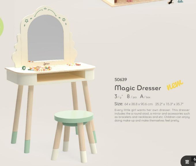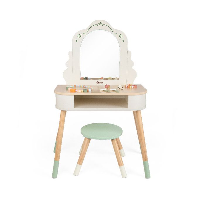 每個小女孩心中都有一個公主夢,夢幻魔法梳妝台,專為小朋友打造專屬的美麗角落。整組包含圓凳、鏡子及多款木製飾品配件,像是項鍊、手鍊與髮飾,讓孩子能模仿大人的梳妝打扮遊戲,滿足角色扮演的樂趣。高質感木材搭配溫潤安全的圓角設計,不僅穩固耐用,也兼顧安全性。透過整理配件、裝扮打扮的過程,能提升孩子的手眼協調與生活自理能力,更能激發想像力與自信心。簡約北歐風配色,擺放於房間或遊戲區都能增添溫馨氛圍,是一款兼具美觀與實用的夢幻禮物。