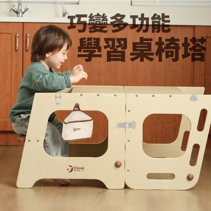 讓學習更有趣!結合學習塔與桌椅功能,一物多用,陪伴孩子從探索、攀爬到學習。小朋友可站上學習塔,安全地參與廚房或親子活動;也能快速轉換成桌椅組,適合繪畫、閱讀與遊戲。附有黑板設計,增添書寫與創作樂趣。堅固木質結構,圓角設計,兼顧安全與耐用,讓孩子在自主探索與角色扮演中成長。多變造型靈活應用,是家庭中不可或缺的實用木製益智家具。