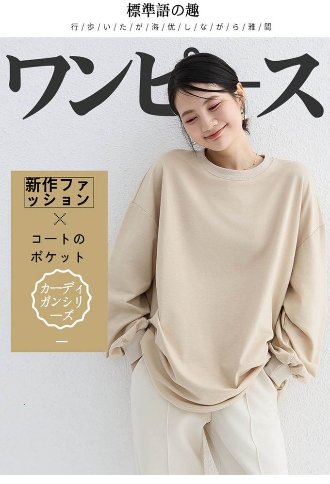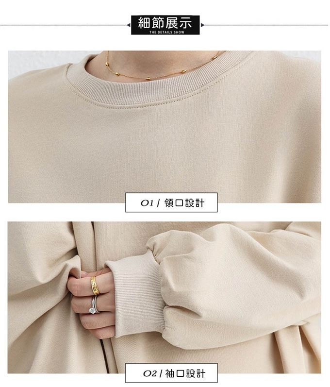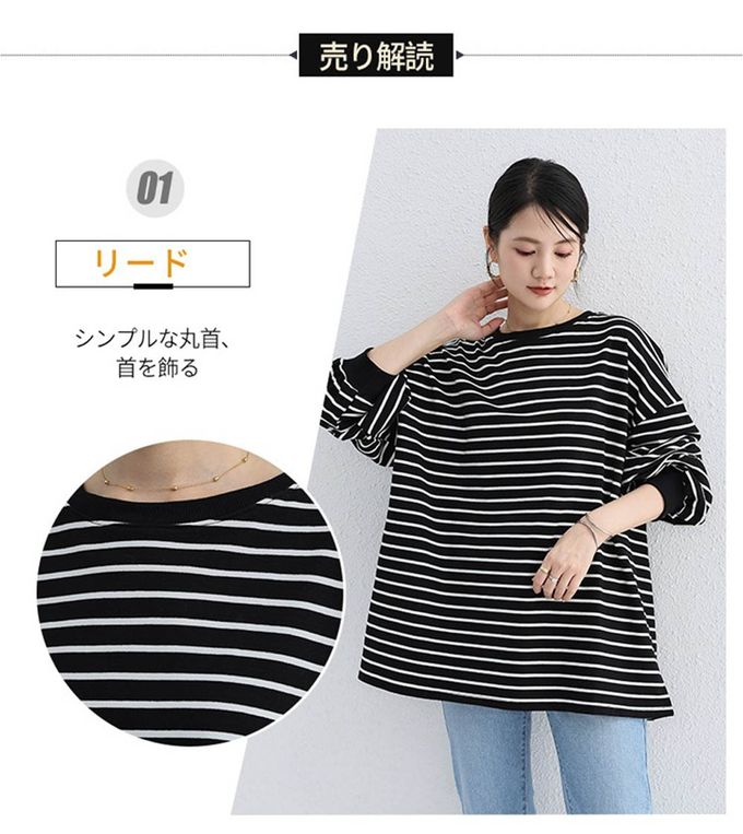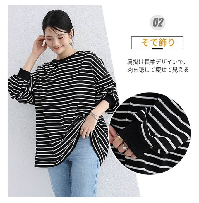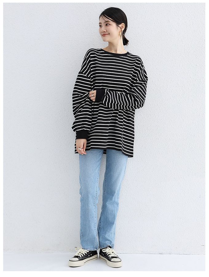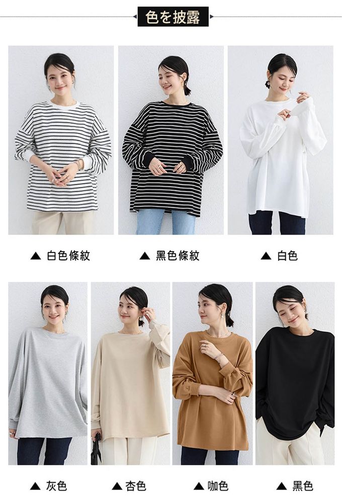 簡約休閒圓領落肩長袖上衣-黑色條紋
