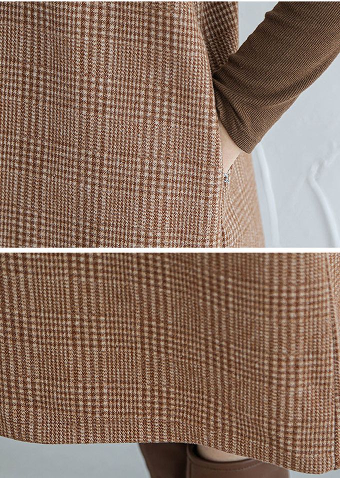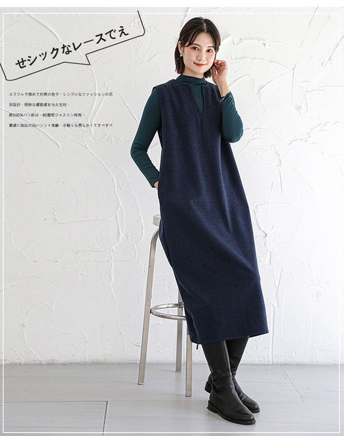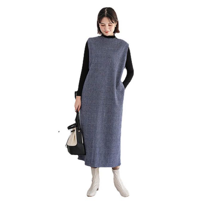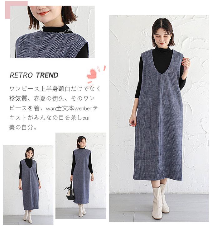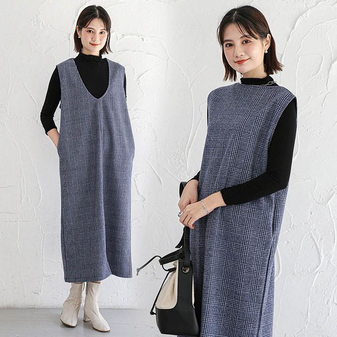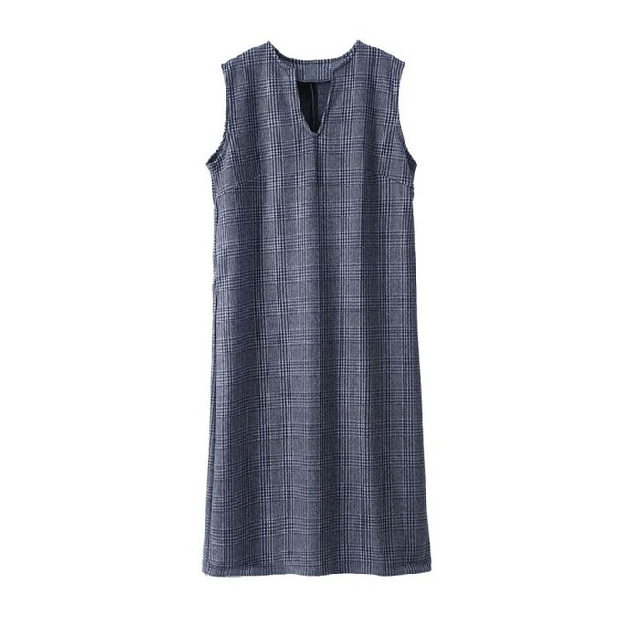毛呢感V領背心裙-小V領-牛仔藍格