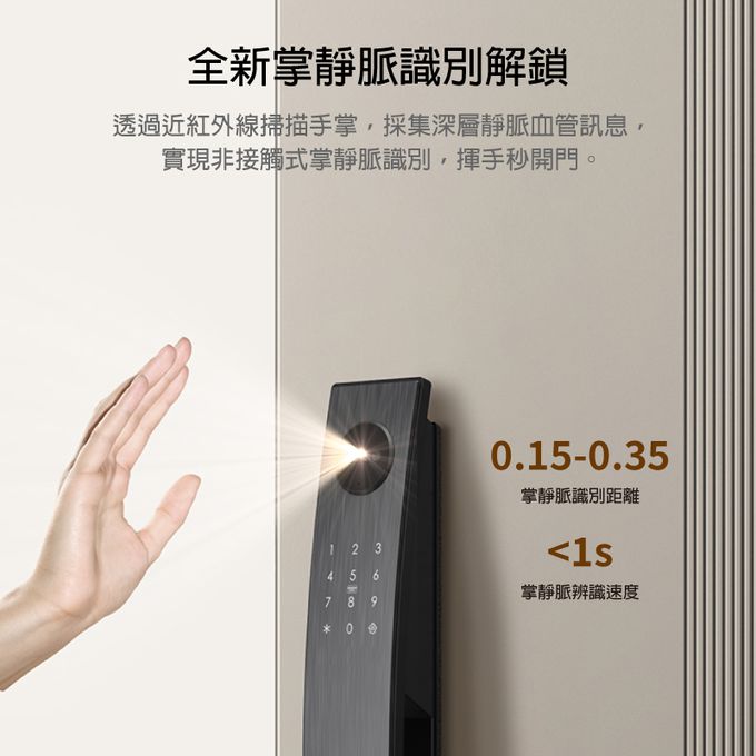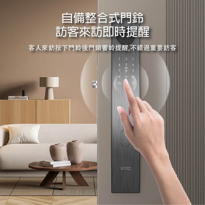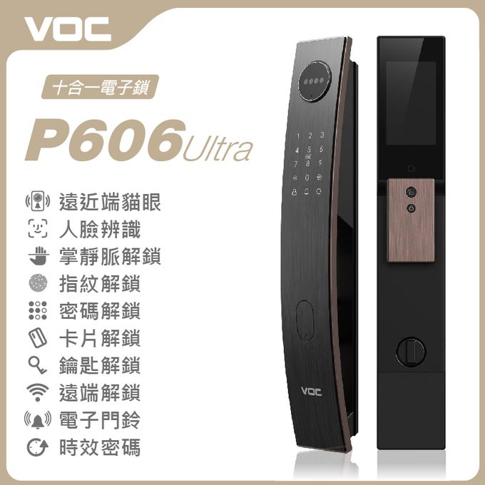 VOC電子鎖 VOC P606 Ultra 十合一電子門鎖是VOC目前所推出功能最強大的旗艦款大門電子鎖,擁有最先進掌靜脈辨識解鎖技術,透過紅外線掃瞄手掌,採集深層靜脈血管訊息,實現非接觸式掌靜脈識別,揮手秒開門。