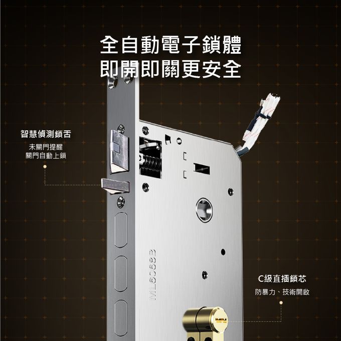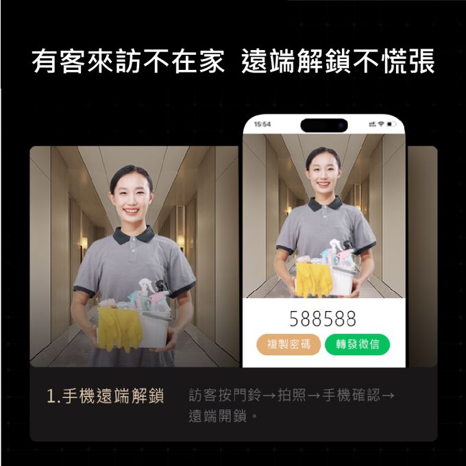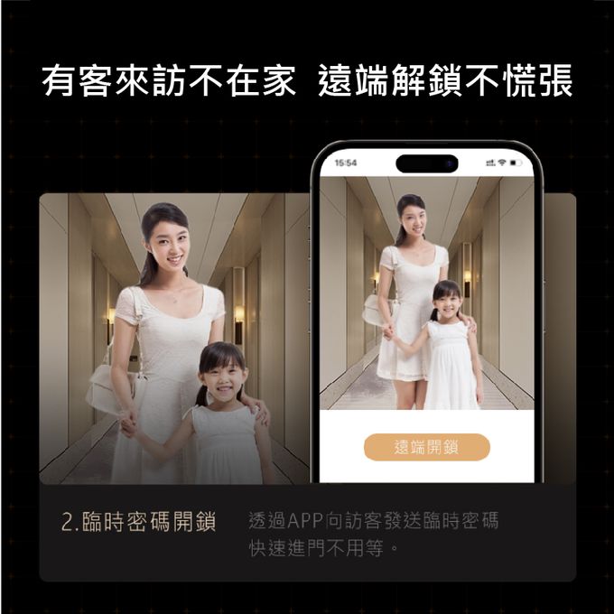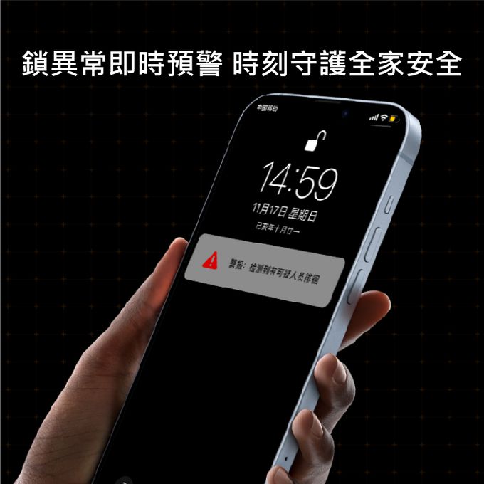 九合一電子鎖當有訪客按下門鈴時,內鎖螢幕會自動喚醒讓家中成員一眼看清楚門外的狀況;當有訪客按下門鈴時,手機APP會自動推播可透過手機APP遠端與訪客視訊溝通,且讓主人看清楚門外的狀況,確認訪客後再開門提升居家安全,當外出時;當發現有人在門前逗留時,鎖體拍攝短照片並推播警報訊息至手機App ;手機APP還能自動記錄成員回家時間,掌握家人每天的回家時間。