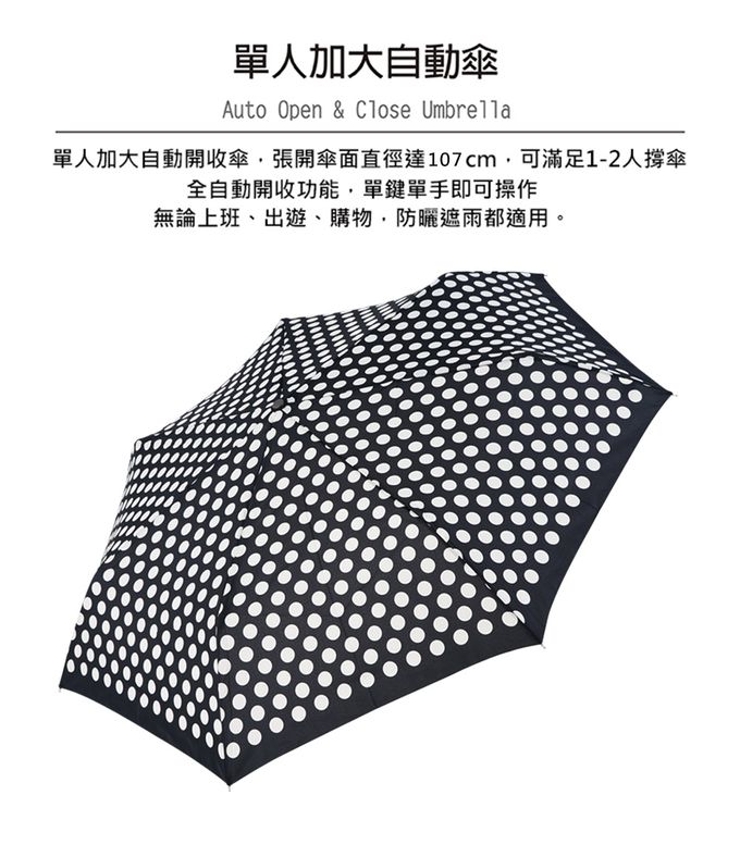 之前就買過好幾支Rain Story的雨傘,蠻好用的,這次為了下雨天接送寶寶,買了個人加大自動傘,把寶寶揹在身上時傘面夠大,兩人都不會淋濕,傘面圖案繽紛可愛,自動開關不會卡卡的