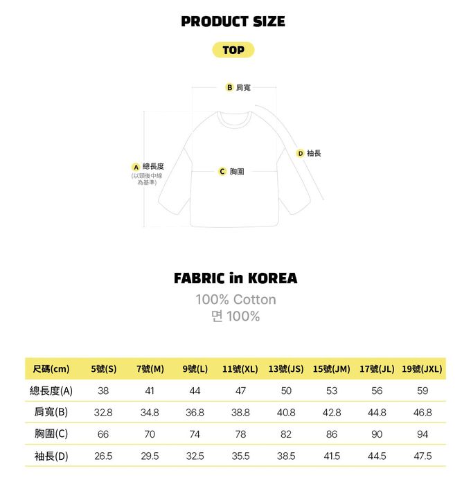 1. 尺寸表單位皆為公分(cm),實際尺寸會因布料彈性、水洗、測量起訖點等因素略有誤差。2. 第一次穿之前,建議單獨手洗。3. 水溫請參照上方個別洗滌建議,以免造成移染或掉色。4. 深淺色請分開洗滌,避免造成互相移染。請使用中性洗劑。浸泡時間不宜過長。5. 衣物若含圖案、印花等設計均建議手洗;如需機洗,請務必將衣服翻面放入洗衣網、再放洗衣機,以免刮損圖樣。(若有標註不可機洗或乾洗,請勿機洗、乾洗)6. 請勿使用漂白劑、螢光增白劑及衣物柔軟劑,以免破壞布料或導致掉色。7. 洗滌後立刻晾乾,勿使用烘衣機。過分烘乾可能會破壞織物纖維、導致衣物收縮。如有熨燙需求,請低溫熨燙。8. 模特實穿照因拍攝環境條件因素,與實品之間可能會存在色差,且因每台電腦、手機或平板等設備之螢幕亮度、解析度不同,請參考商品平拍圖、並以實品顏色為準,謝謝媽咪爸比們的體諒。