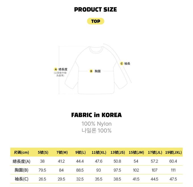 1. 尺寸表單位皆為公分(cm),實際尺寸會因布料彈性、水洗、測量起訖點等因素略有誤差。2. 第一次穿之前,建議單獨手洗。3. 水溫請參照上方個別洗滌建議,以免造成移染或掉色。4. 深淺色請分開洗滌,避免造成互相移染。請使用中性洗劑。浸泡時間不宜過長。5. 衣物若含圖案、印花等設計均建議手洗;如需機洗,請務必將衣服翻面放入洗衣網、再放洗衣機,以免刮損圖樣。(若有標註不可機洗或乾洗,請勿機洗、乾洗)6. 請勿使用漂白劑、螢光增白劑及衣物柔軟劑,以免破壞布料或導致掉色。7. 洗滌後立刻晾乾,勿使用烘衣機。過分烘乾可能會破壞織物纖維、導致衣物收縮。如有熨燙需求,請低溫熨燙。8. 模特實穿照因拍攝環境條件因素,與實品之間可能會存在色差,且因每台電腦、手機或平板等設備之螢幕亮度、解析度不同,請參考商品平拍圖、並以實品顏色為準,謝謝媽咪爸比們的體諒。