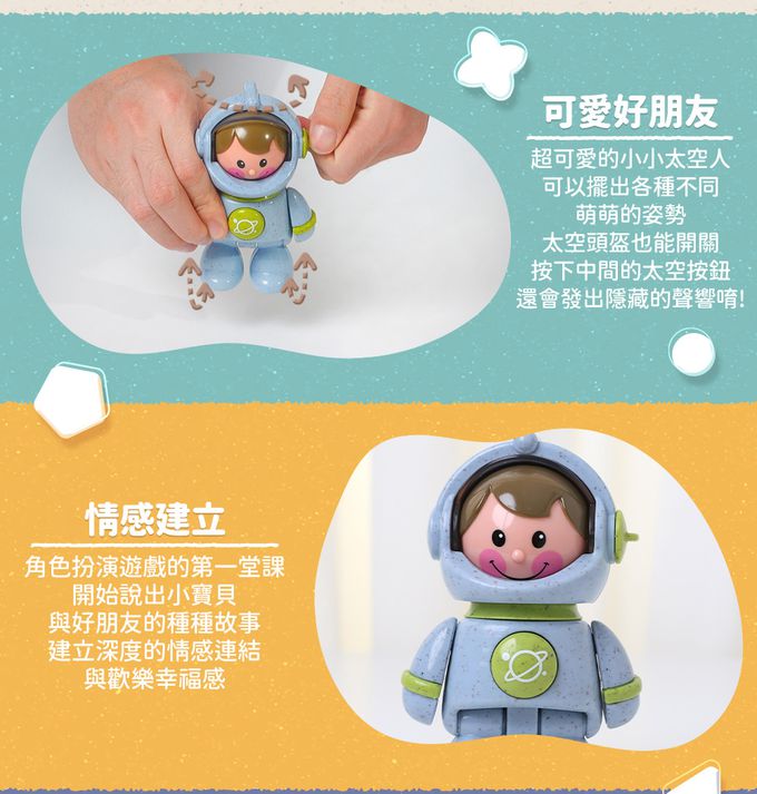 。超可愛的小小太空人擺出各種不同萌萌的姿勢,太空頭盔也能開關,也會發出隱藏的聲響