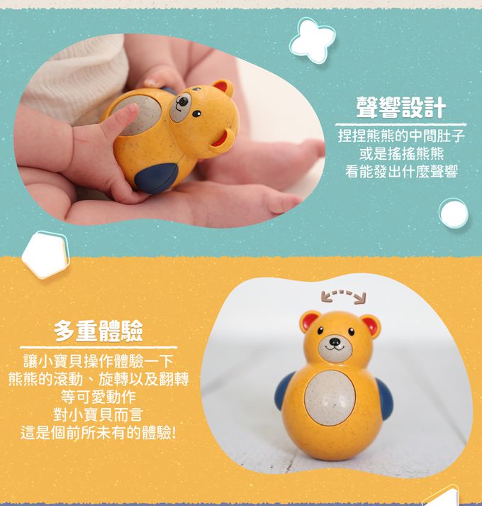 。連續多年獲得世界各地啟蒙開發設計大獎。採安全塑膠與天然有機小麥混搭材質,搭配高質感的定型收邊,確保小寶貝最安全的玩樂。適合6個月以上的寶貝。專為小小手所設計的完美大小。讓小寶貝操作體驗一下熊熊的滾動、旋轉以及翻轉等可愛動作,對小寶貝而言,這是個前所未有的體驗!。捏捏熊熊的中間肚子看能發出什麼聲響。開發小寶貝多重感官能力,顏色形狀認知力,手眼協調力,提升抓握力,更讓小寶貝能安全盡情地探索!。商品通過台灣商檢局嬰幼兒玩具安全檢驗合格,證號M38383