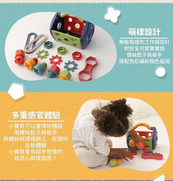 。小寶貝可以盡情地體驗用螺絲起子與板手將螺絲與螺帽鎖上與鬆開的全新體驗,小寶貝會有超乎想像的自信心與成就感!