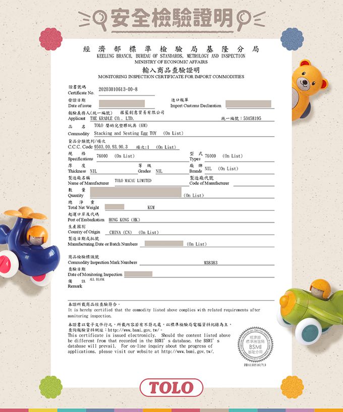 。商品通過台灣商檢局嬰幼兒玩具安全檢驗合格,證號M38383