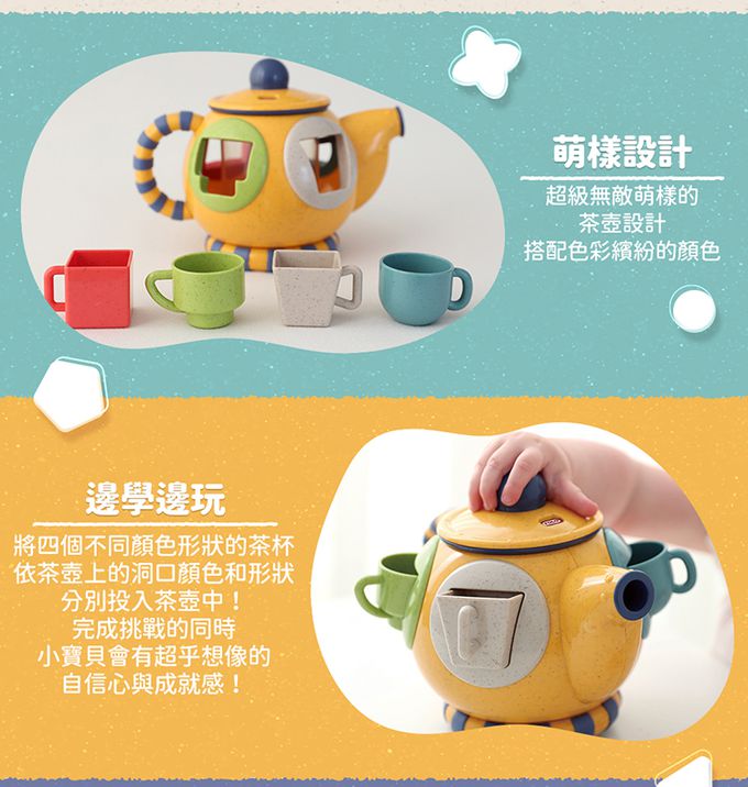 。小寶貝的挑戰為,將四個不同顏色形狀的茶杯,依照茶壺上的洞口顏色和形狀,分別投入茶壺中! 在完成挑戰的同時,小寶貝會有超乎想像的自信心與成就感!