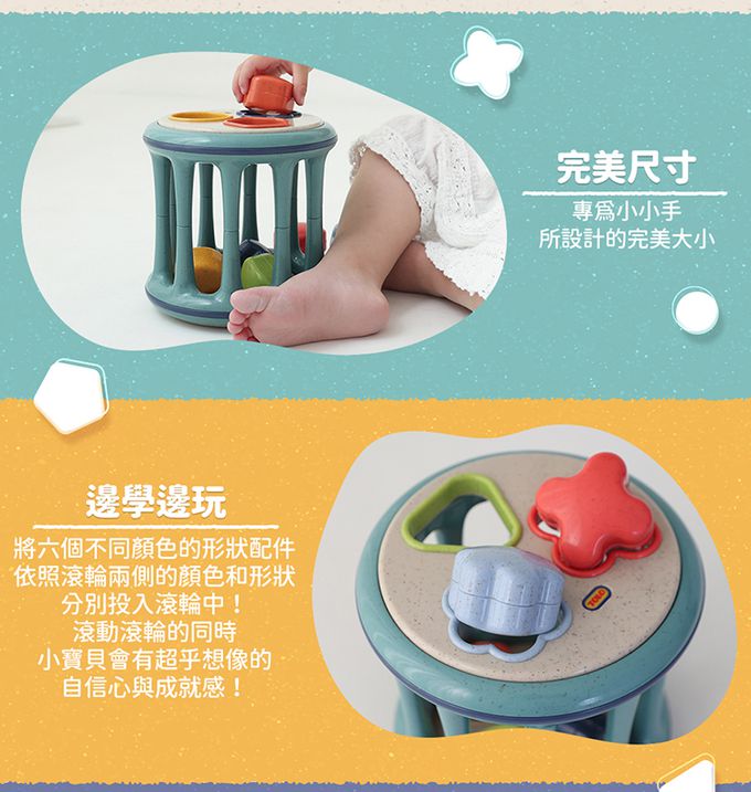 。小寶貝的挑戰為,將六個不同顏色的形狀配件,依照滾輪兩側的顏色和形狀,分別投入滾輪中! 在完成挑戰,滾動滾輪的同時,小寶貝會有超乎想像的自信心與成就感!