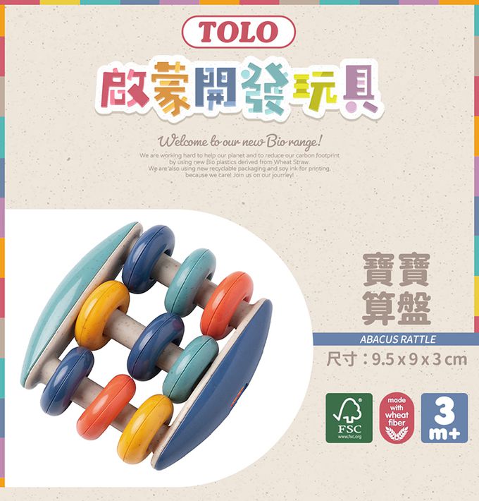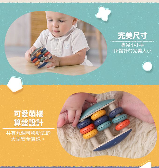 。連續多年獲得世界各地啟蒙開發設計大獎。採安全塑膠與天然有機小麥混搭材質,搭配高質感的定型收邊,確保小寶貝最安全的玩樂。適合3個月以上的寶貝。專為小小手所設計的完美大小。可愛萌樣算盤設計,共有九個可移動式的大型安全算珠。。開發小寶貝多重感官能力,顏色形狀認知力,手眼協調力,提升抓握力,更讓小寶貝能安全盡情地探索!。商品通過台灣商檢局嬰幼兒玩具安全檢驗合格,證號M38383