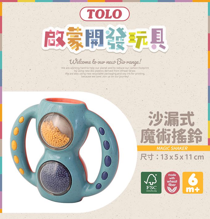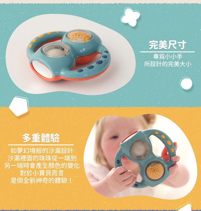 。連續多年獲得世界各地啟蒙開發設計大獎。採安全塑膠與天然有機小麥混搭材質,搭配高質感的定型收邊,確保小寶貝最安全的玩樂。適合6個月以上的寶貝。專為小小手所設計的完美大小。如夢幻境般的沙漏設計,沙漏裡面的珠珠從一端到另一端時會產生顏色的變化,對於小寶貝而言,是個全新神奇的體驗!。開發小寶貝多重感官能力,顏色形狀認知力,手眼協調力,提升抓握力,更讓小寶貝能安全盡情地探索!。商品通過台灣商檢局嬰幼兒玩具安全檢驗合格,證號M38383