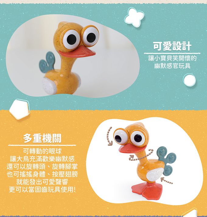 。連續多年獲得世界各地啟蒙開發設計大獎。採安全塑膠與天然有機小麥混搭材質,搭配高質感的定型收邊,確保小寶貝最安全的玩樂。適合3個月以上的寶貝。專為小小手所設計的完美大小。讓小寶貝笑開懷的幽默感官玩具。可轉動的眼球讓大鳥充滿歡樂幽默感,小寶貝可以旋轉頭、旋轉腳掌、更可以搖搖身體、按壓翅膀發出聲響。開發小寶貝多重感官能力,顏色形狀認知力,手眼協調力,提升抓握力,更讓小寶貝能安全盡情地探索。也可以當固齒玩具使用。商品通過台灣商檢局嬰幼兒玩具安全檢驗合格,證號M38383