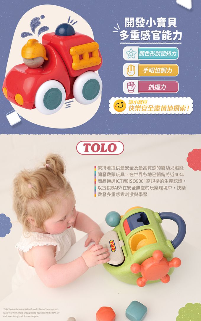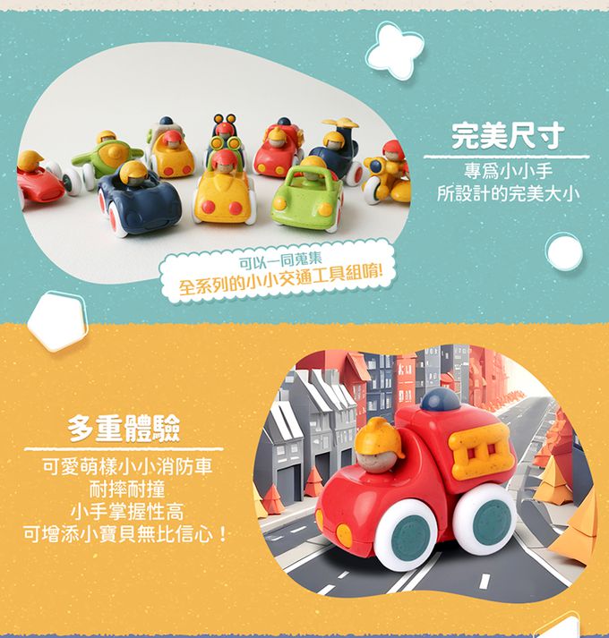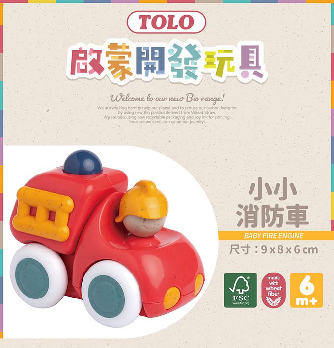 。連續多年獲得世界各地啟蒙開發設計大獎。採安全塑膠與天然有機小麥混搭材質,搭配高質感的定型收邊,確保小寶貝最安全的玩樂。適合6個月以上的寶貝。專為小小手所設計的完美大小。可愛萌樣的小消防車,耐摔耐撞,小手掌握性高,可增添小寶貝無比信心!。開發小寶貝多重感官能力,顏色形狀認知力,手眼協調力,提升抓握力,更讓小寶貝能安全盡情地探索!。可以蒐集全系列的小小交通工具系列組。商品通過台灣商檢局嬰幼兒玩具安全檢驗合格,證號M38383