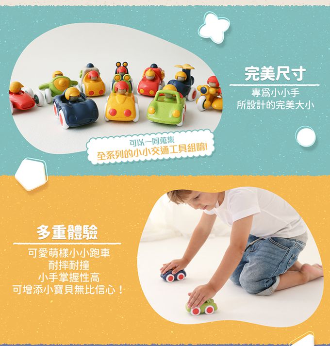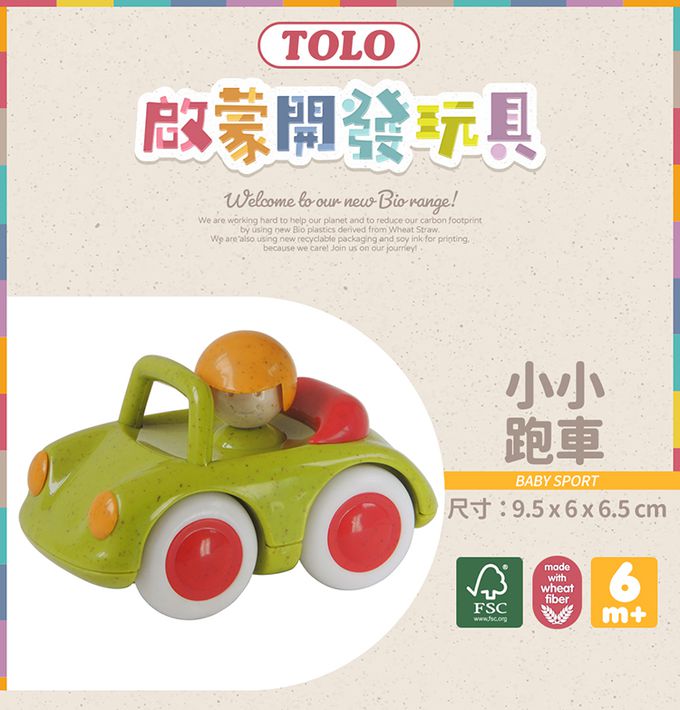。連續多年獲得世界各地啟蒙開發設計大獎。採安全塑膠與天然有機小麥混搭材質,搭配高質感的定型收邊,確保小寶貝最安全的玩樂。適合6個月以上的寶貝。專為小小手所設計的完美大小。可愛萌樣的小跑車,耐摔耐撞,小手掌握性高,可增添小寶貝無比信心!。開發小寶貝多重感官能力,顏色形狀認知力,手眼協調力,提升抓握力,更讓小寶貝能安全盡情地探索!。可以蒐集全系列的小小交通工具系列組。商品通過台灣商檢局嬰幼兒玩具安全檢驗合格,證號M38383