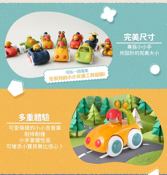 。連續多年獲得世界各地啟蒙開發設計大獎。採安全塑膠與天然有機小麥混搭材質,搭配高質感的定型收邊,確保小寶貝最安全的玩樂。適合6個月以上的寶貝。專為小小手所設計的完美大小。可愛萌樣的小吉普車,耐摔耐撞,小手掌握性高,可增添小寶貝無比信心!。開發小寶貝多重感官能力,顏色形狀認知力,手眼協調力,提升抓握力,更讓小寶貝能安全盡情地探索!。可以蒐集全系列的小小交通工具系列組。商品通過台灣商檢局嬰幼兒玩具安全檢驗合格,證號M38383