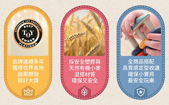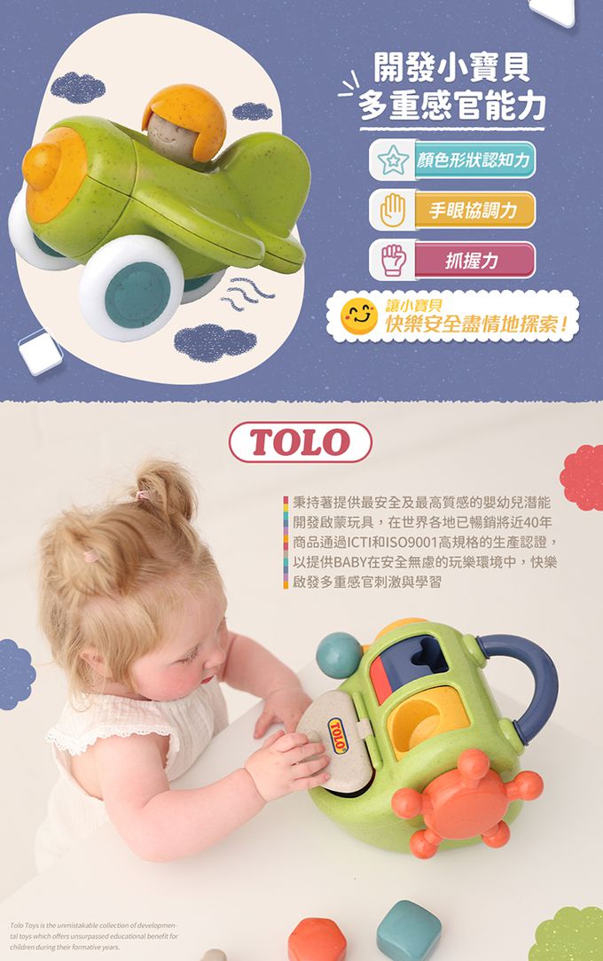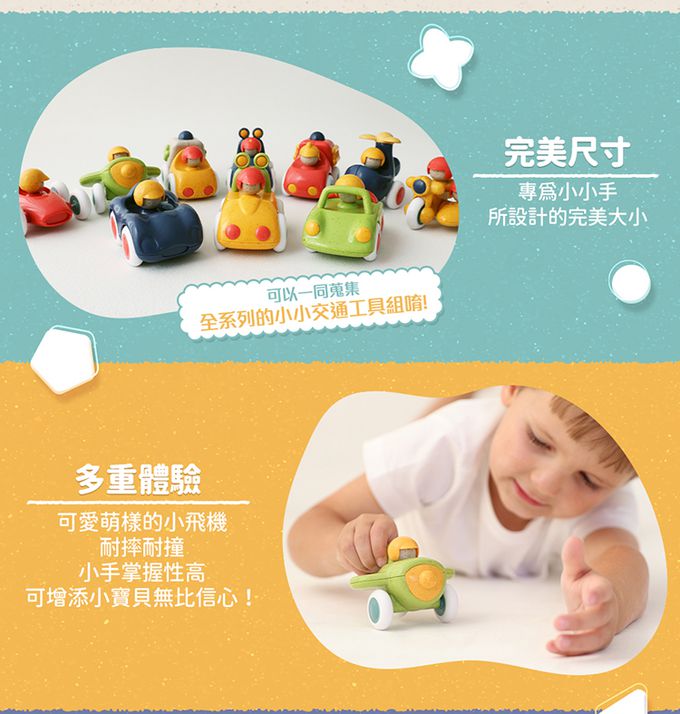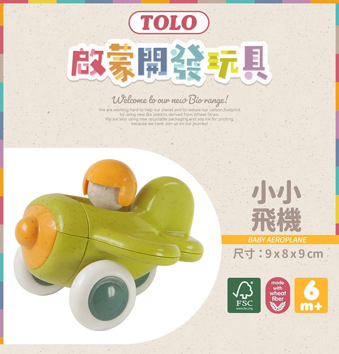 。連續多年獲得世界各地啟蒙開發設計大獎。採安全塑膠與天然有機小麥混搭材質,搭配高質感的定型收邊,確保小寶貝最安全的玩樂。適合6個月以上的寶貝。專為小小手所設計的完美大小。可愛萌樣的小飛機,耐摔耐撞,小手掌握性高,可增添小寶貝無比信心!。開發小寶貝多重感官能力,顏色形狀認知力,手眼協調力,提升抓握力,更讓小寶貝能安全盡情地探索!。可以蒐集全系列的小小交通工具系列組。商品通過台灣商檢局嬰幼兒玩具安全檢驗合格,證號M38383