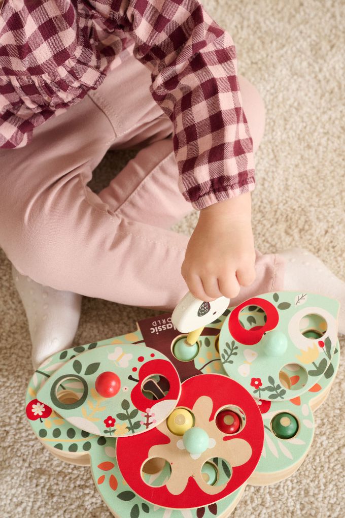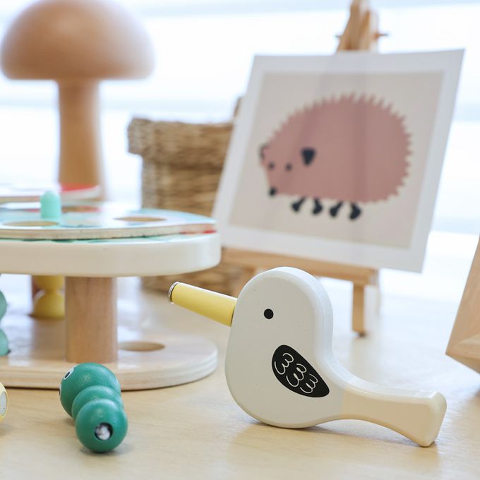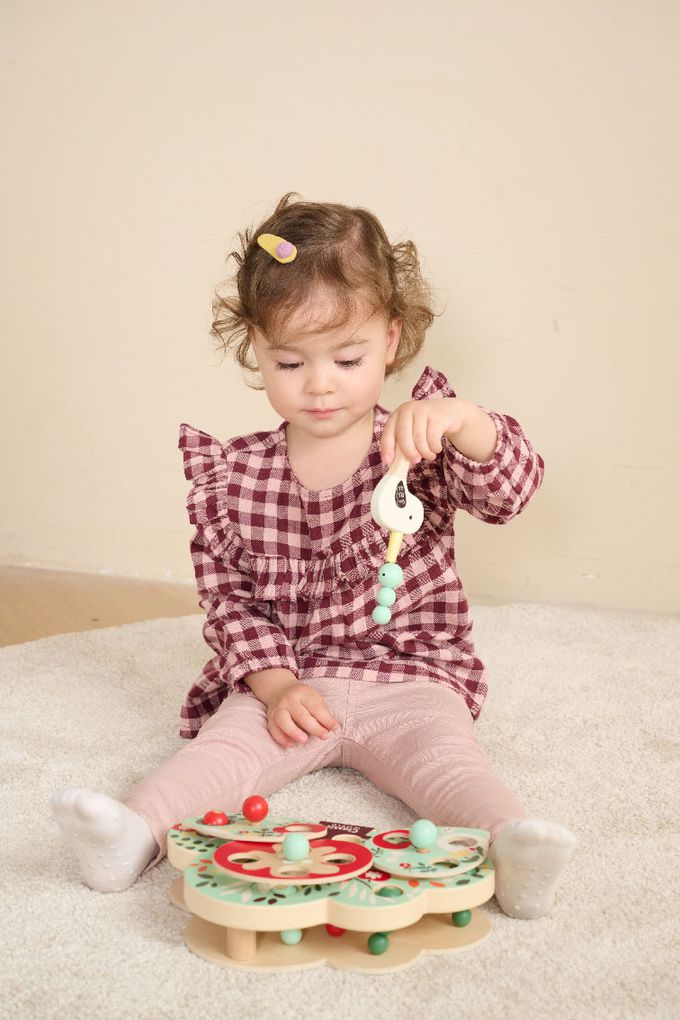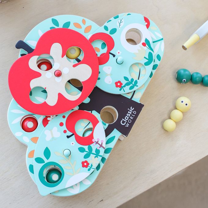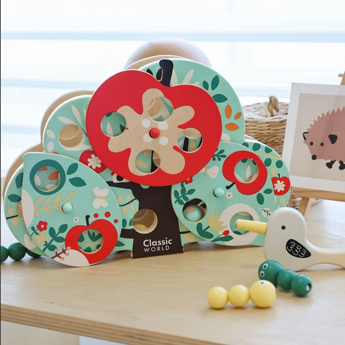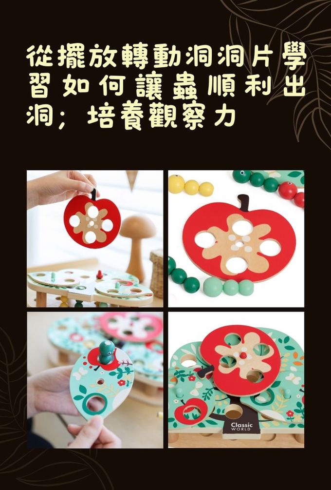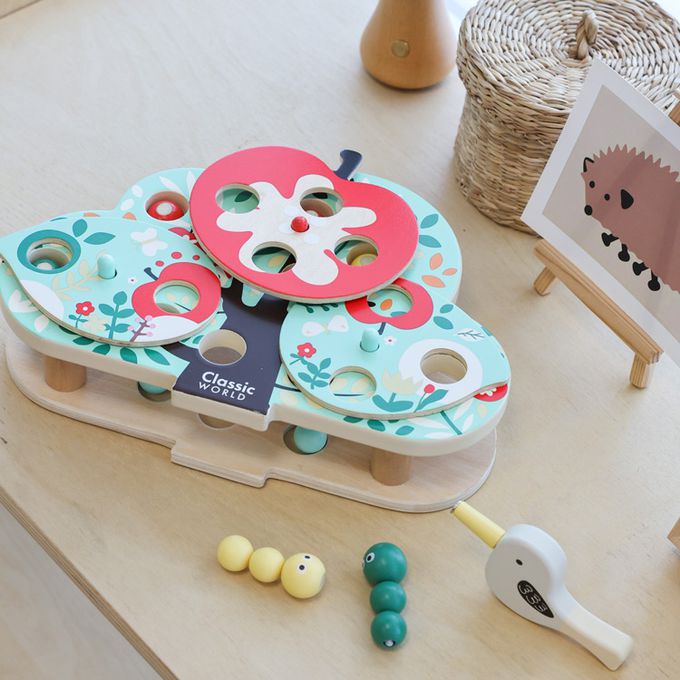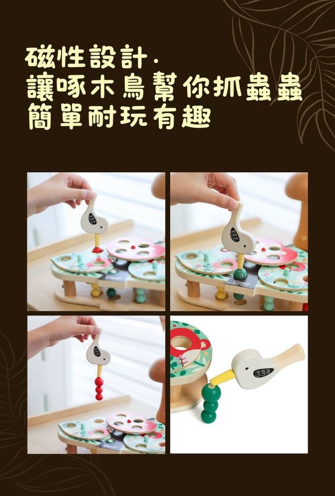 這款玩具以色彩繽紛的木製構件和創意十足的遊戲方式,讓孩子們扮演小小啄木鳥,利用磁性工具找出藏在樹葉和果實中的蟲子。