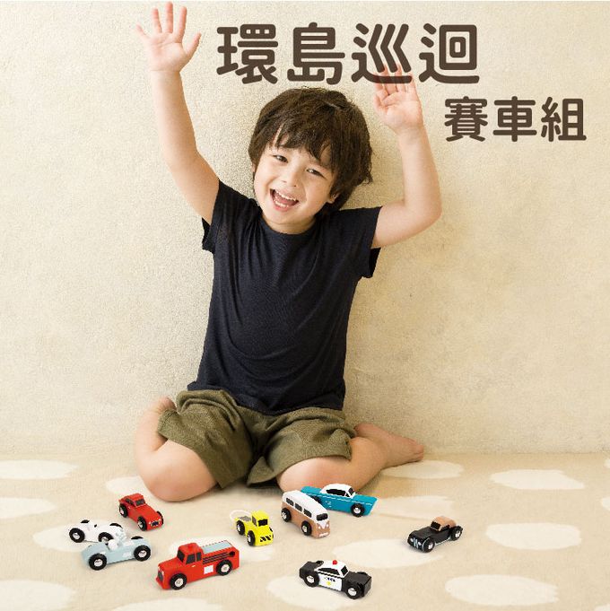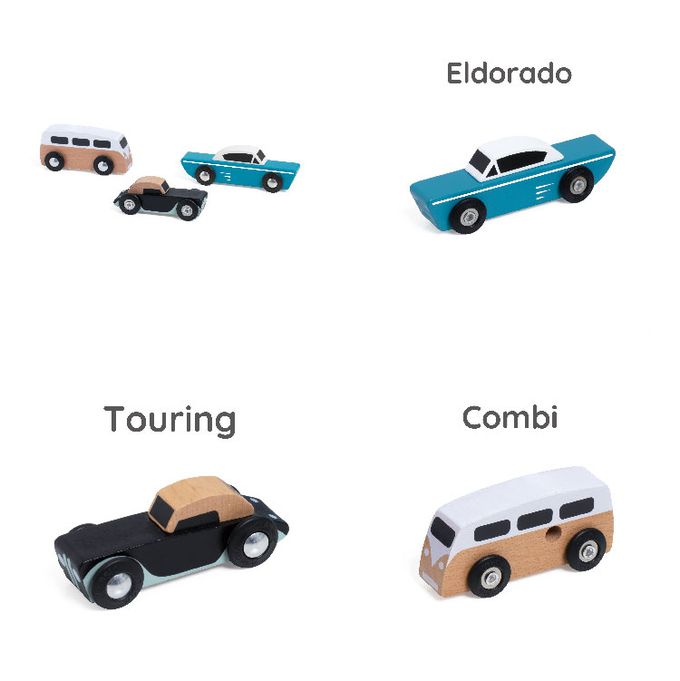 環島巡迴賽車組內含一台房車、一台敞篷車和一台小巴士。每一輛車都能在火車軌道上行駛,讓孩子們可以盡情遊玩,並且透過遊戲來發展精細動作技能和語言能力。這些小巧的車輛採用50年代的經典設計,讓孩子們感受到汽車的黃金時代。使用FSC認證的木材製成,確保環保與安全性。