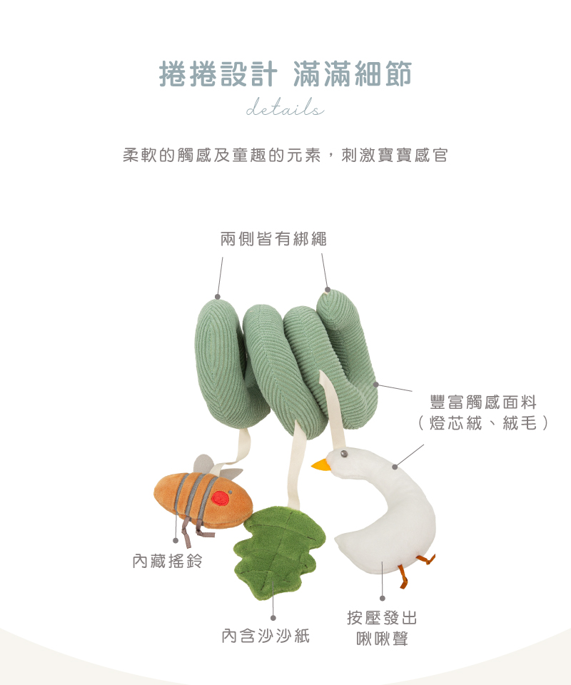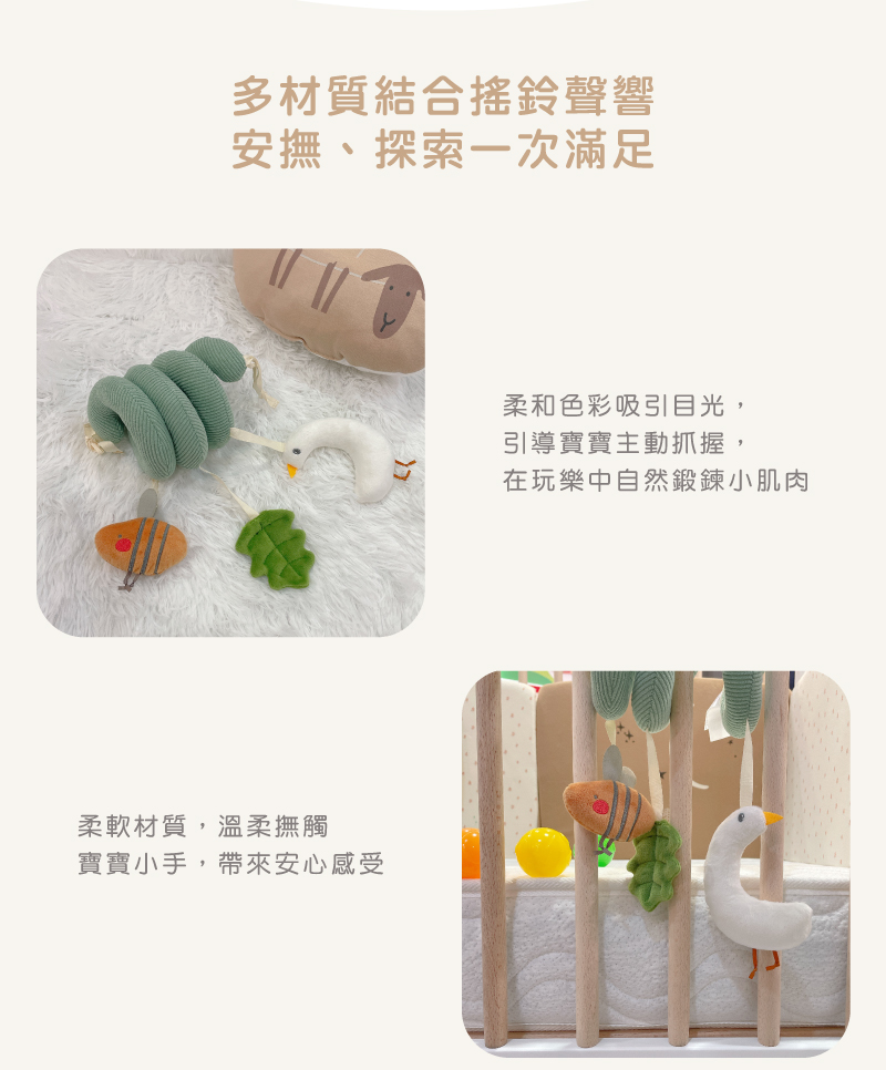 ■ 商品說明:用童趣的"BBD捲捲安撫玩具"讓寶寶維持愉悅的心情。22x13公分的尺寸,可以輕鬆地掛在推車、汽座或嬰兒床上,柔軟的觸感及童趣的元素,刺激寶寶感官的同時,勳練寶寶的手眼協調。適合好奇心旺盛的小小探險家。