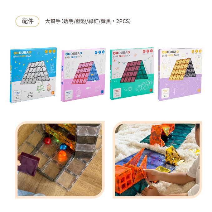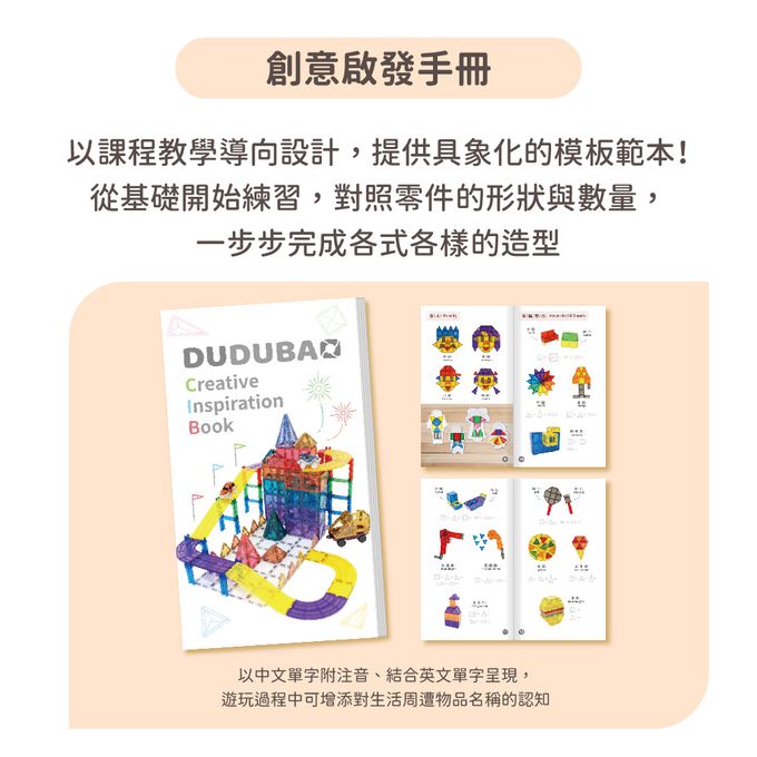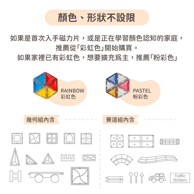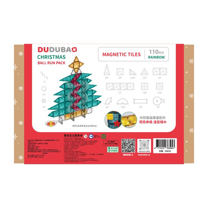 正方形磁力片9片(綠色*4透明*4黃*1),二連片磁力片2片(綠色*2),四連片磁力片1片(黃色*1),大顆粒磁力片10片(綠色*10)、圓孔磁力片13片(透明*13)、小三角磁力片12片(綠色*6黃色*4透明*2)、直三角磁力片24片(綠色*12紅色*12),長三角磁力片6片(綠色*6),4/1圓管道2個(透明*2),2/1圓管道10個(透明*10),長直管7個(透明*7),圓盤1個(透明*1),積木8PCS,炫光球4顆(紅藍黃綠各1顆),LED燈條造,造型手冊(20頁)*1。