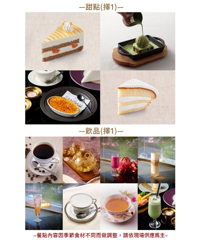 ●飲品(擇1):南義美式咖啡(冰/熱)/沖繩黑糖拿鐵咖啡(冰/熱)/德國有機舒福茶(熱)/苗栗銅鑼菊花茶(熱)/蜜香睡蓮花茶(熱)/宇治抹茶歐蕾(冰/熱)/伯爵奶茶(冰/熱)/季節果汁(冰)/櫻花接骨木氣泡飲(冰)