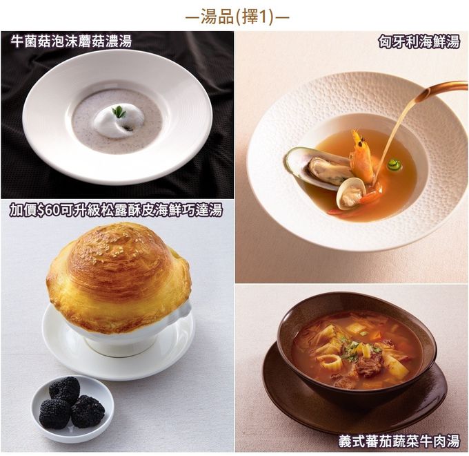 ●湯品(擇1):牛菌菇泡沫蘑菇濃湯/義式蕃茄蔬菜牛肉湯/匈牙利海鮮湯/加價$60可升級松露酥皮海鮮巧達湯[限量]