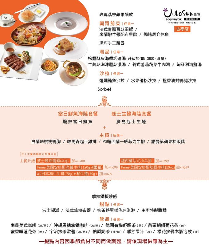 1.單張可1人於墨賞新鐵板料理[古亭店]享用當日鮮魚或起司生蠔海陸套餐乙客(已含服務費)。