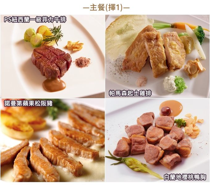 ●主餐(擇1):白蘭地櫻桃鴨胸/帕馬森起士雞排/PS紐西蘭一級菲力牛排/諾曼第蘋果松阪豬[肉品可加價升級]