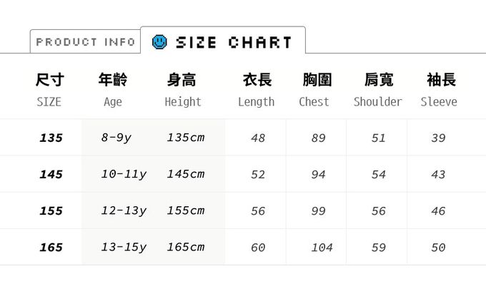 1. 尺寸表單位皆為公分(cm),實際尺寸會因布料彈性、水洗、測量起迄點等因素略有誤差。建議參考孩子平時穿著衣物尺寸進行選購。