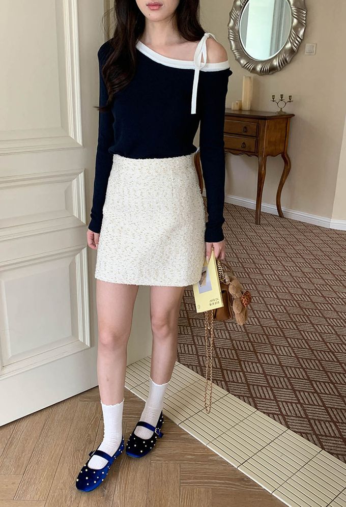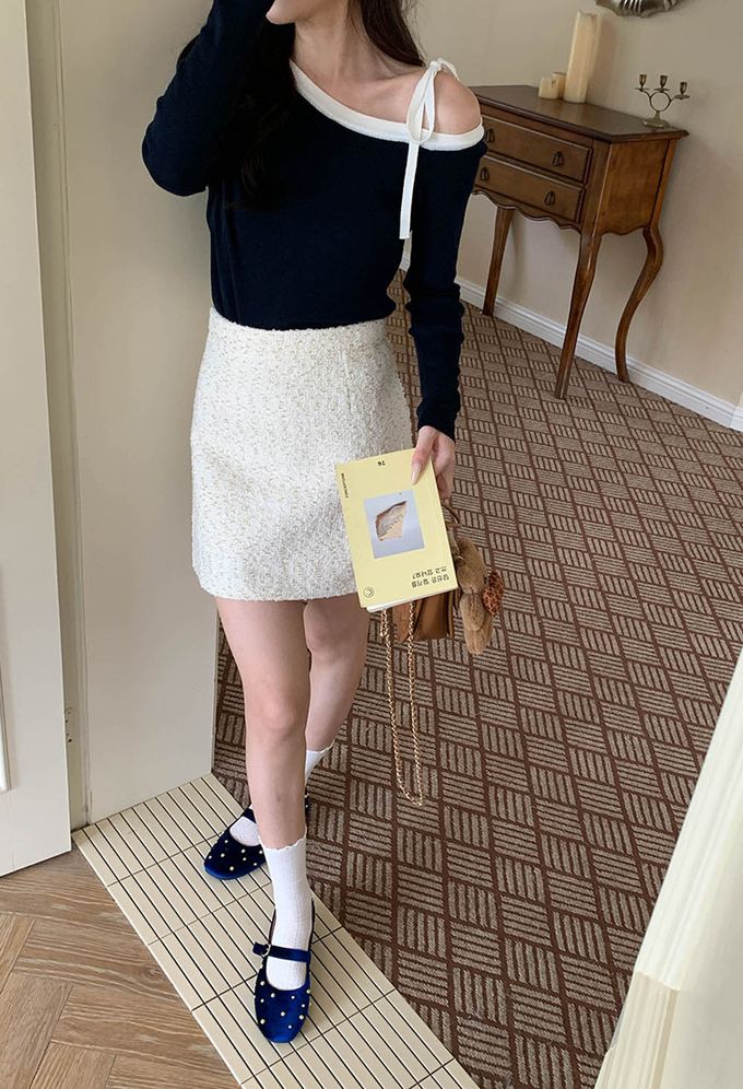 品名:設計感綁帶斜肩撞色長袖針織上衣