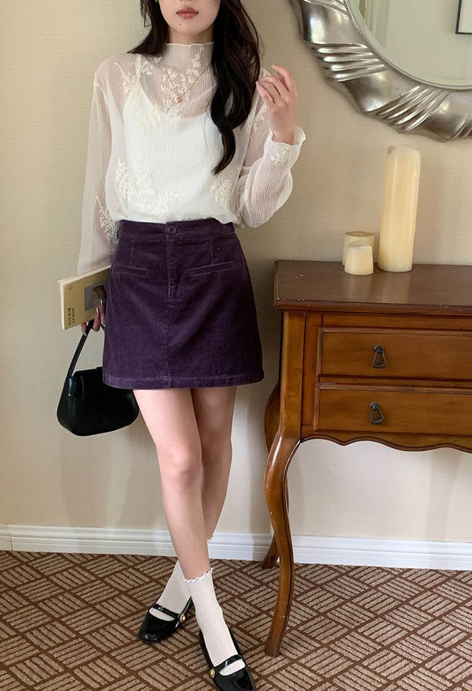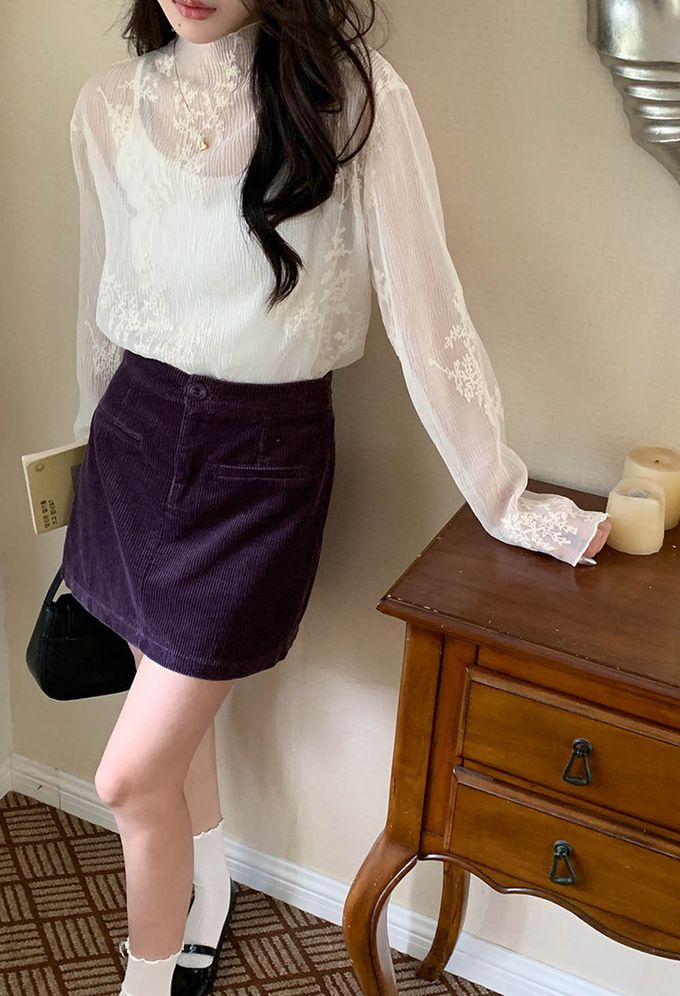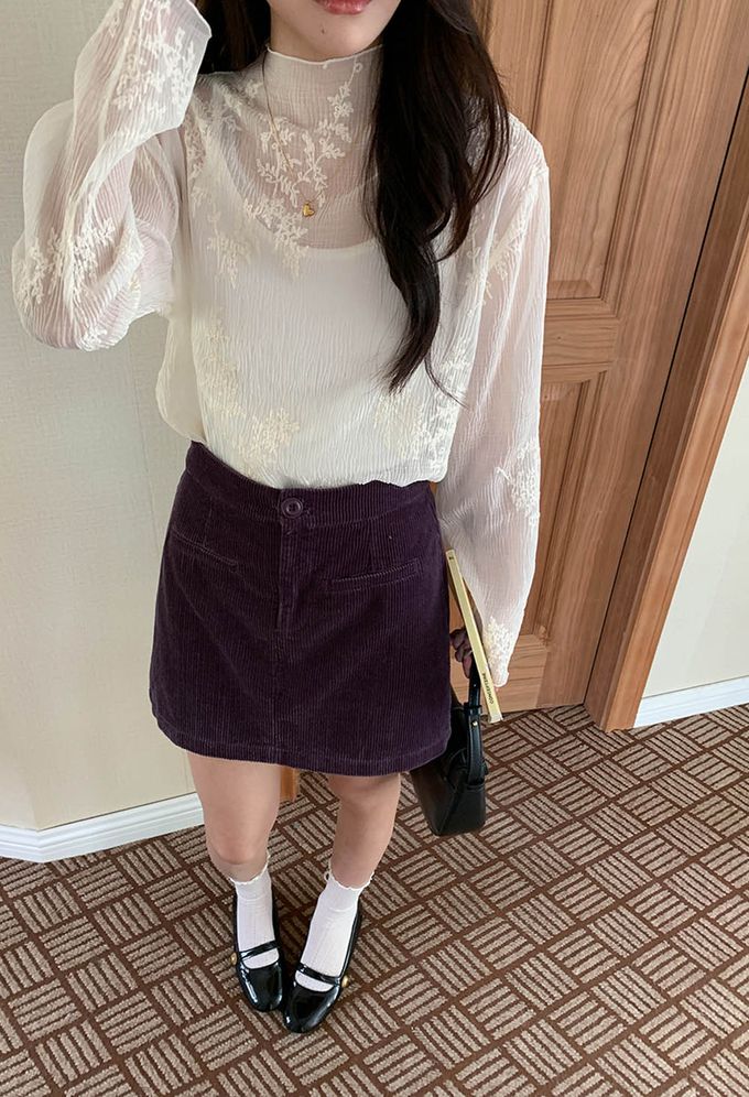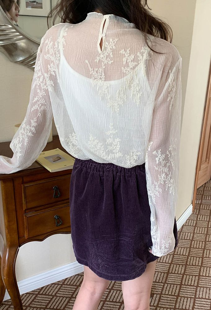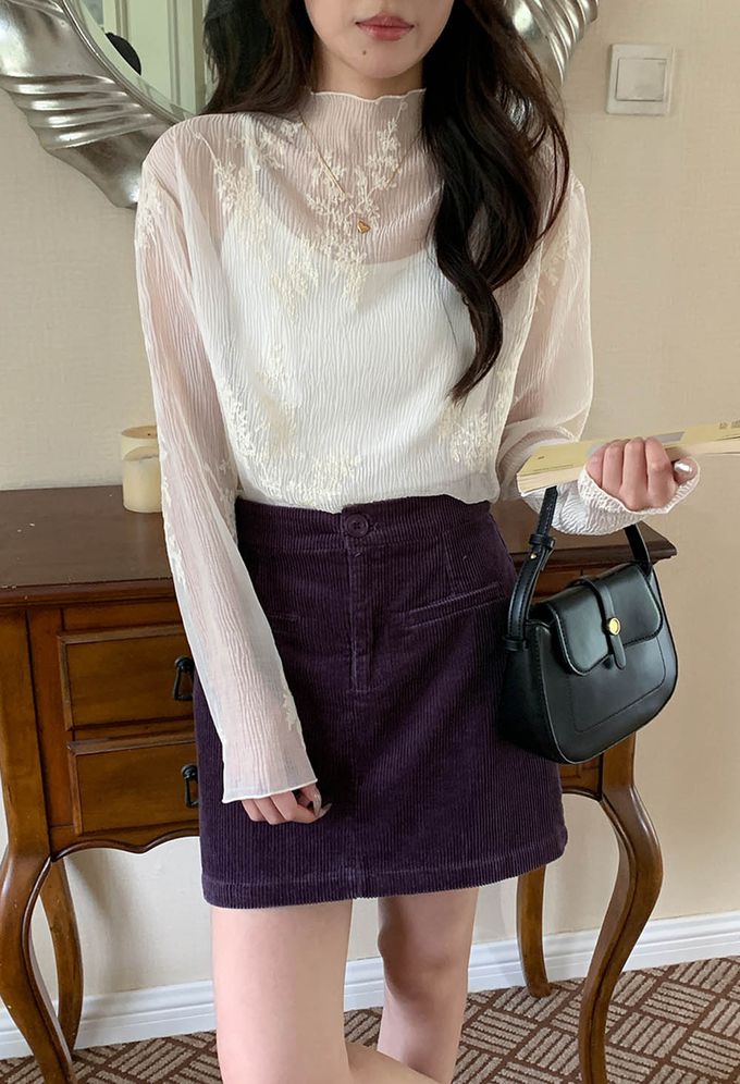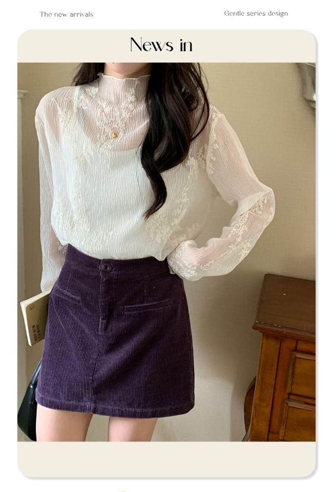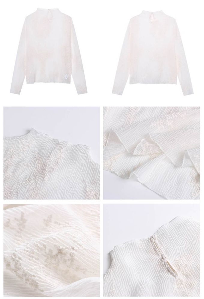 透視感皺摺緹花半高領長袖上衣-杏色 (F)